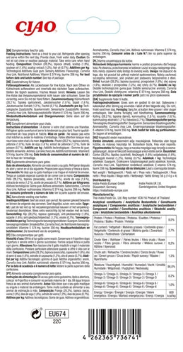 Samenstelling: Water, kip, tapiocazetmeel, Sint-jakobsschelp, sojaolie, natuurlijke smaakstoffen, natuurlijke Sint-jakobsschelparoma, guargom, visolie, vitamine E-supplement, taurine, groene thee-extract